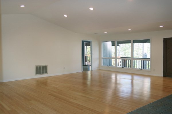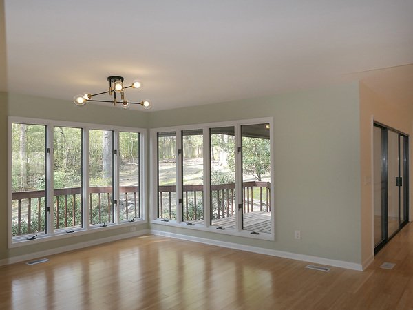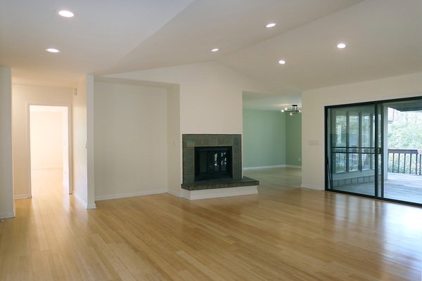 The front exterior stairway leads up to the entry of this one level contemporary. The home features bamboo flooring in the common rooms and master bedroom. The living room features a vaulted ceiling with recessed lighting and a fireplace with tile surround and hearth. A glass slider leads out from the living room to the rear deck and backyard. The rear deck includes a ceiling fan. The dining room is just off of the living room. Two walls of corner windows fill this space with natural light.
