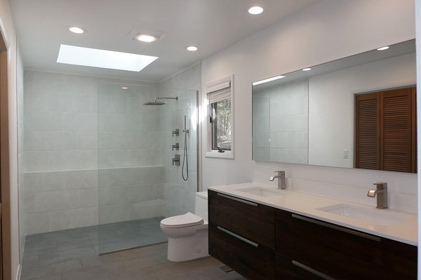 The home features a split bedroom plan. The master bedroom is off the living room. This bedroom features a slider to the front deck and an en suite bathroom with a linen closet and a large walk-in closet. The master bathroom features tile flooring, a skylight, a dual vanity, and walk-in tile shower with dual shower heads including a rain shower.