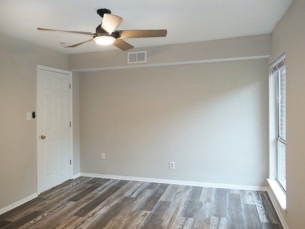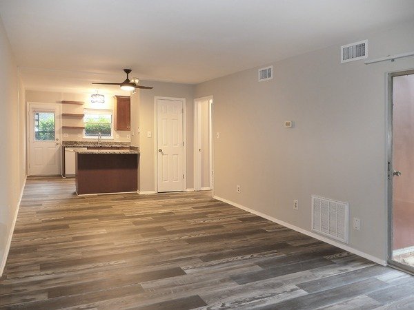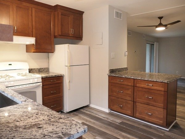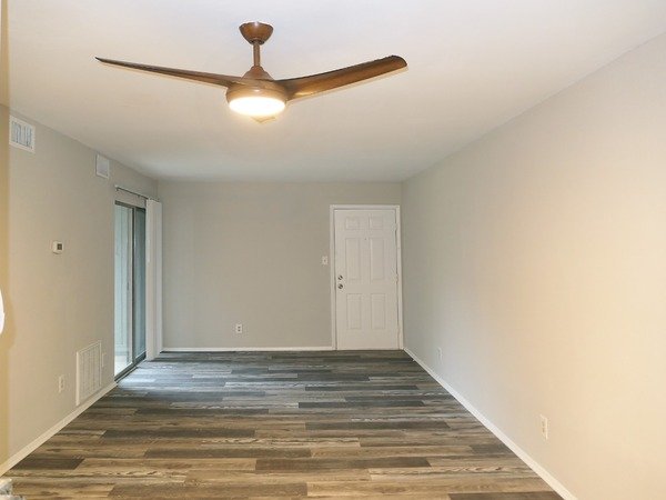 This two bedroom unit features hardwood style vinyl plan flooring in the living area and kitchen. The large living and dining areas combine in a spacious central room. There is a ceiling fan and coat closet in this room. There is a glass slider leading from the living room to a patio.