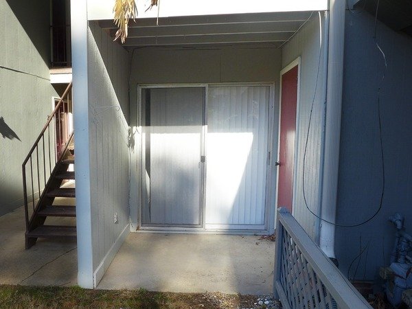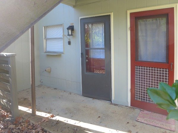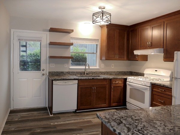 A breakfast bar counter separate the kitchen from the living-dining space. The updated kitchen includes wood cabinets and granite counters. Kitchen appliances are included. A second patio area is off of the kitchen. This patio is shared with the neighbor unit - and serves as your back entry to a rear parking area.