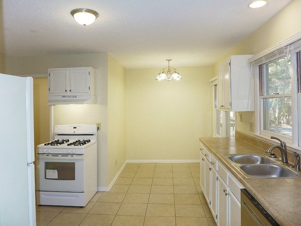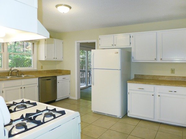 The family room could also serve as a dining room. This room features a decorative fireplace; (the fireplace is inoperable and not for use). This room has hardwood style plank flooring and a glass slider to the deck. The spacious kitchen includes ample cabinets, appliances, and a sunny breakfast area. The kitchen features tile floors. There is additional storage in the utility, and a washer and dryer are included.