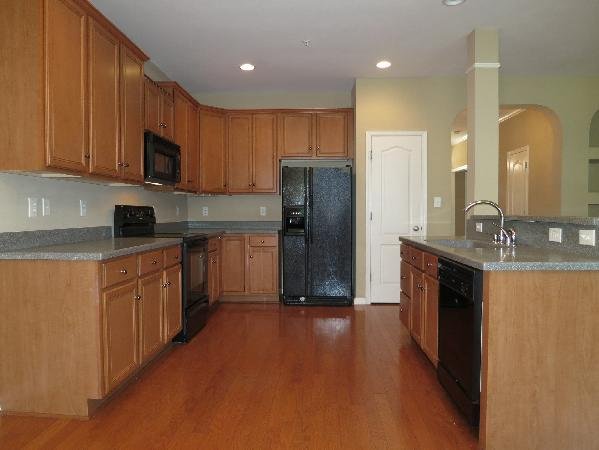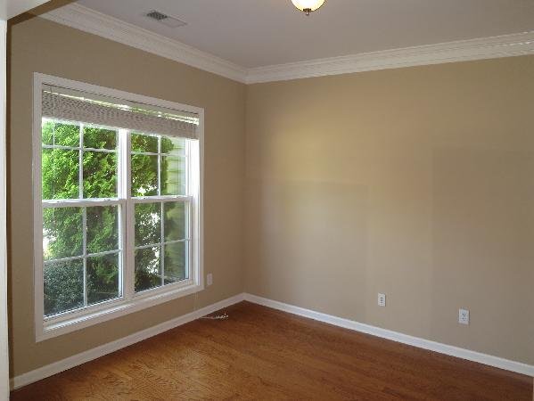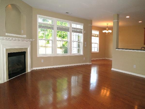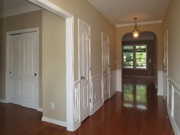 The townhome features hardwood floors throughout the main level. A formal living room or sitting room with a picture window and deep molding is located just off of the entry foyer. The entry foyer is detailed with wainscoting and molding; an arched entry leads from the foyer to the family room.