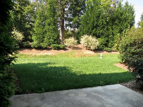 The kitchen includes a raised bar open to the family room, and a large dining space. The kitchen features solid sur countertops, recessed lighting and a pantry closet. All kitchen appliances are included. There is an exit to the back patio from the breakfast area. Landscaped hedges buffer both sides of the patio and yard. A half bath completes the main level.