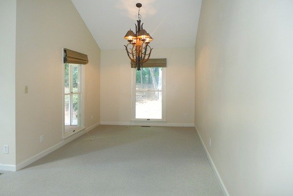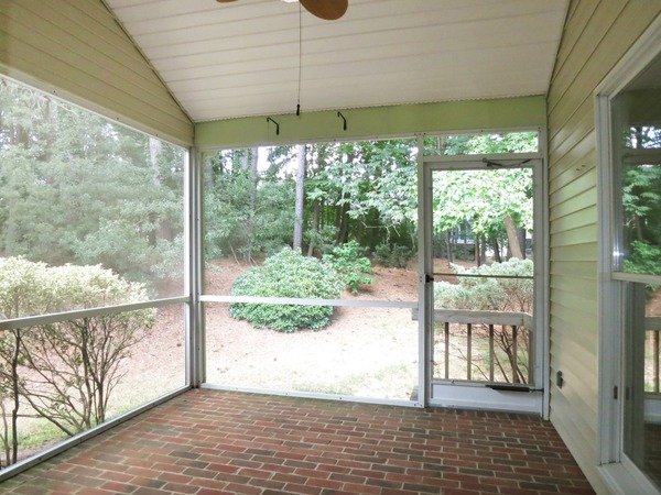 This end-unit townhome in Fearrington Village features an open and airy living room with a vaulted ceiling and skylights, and a gas-log fireplace. The living room is open to the dining space, both with have carpet. There is an exit from the living room to the screened porch. The screened porch features a vaulted ceiling with a fan, brick floor.
