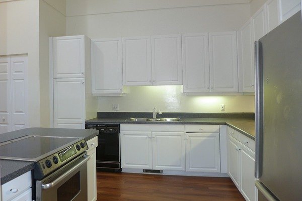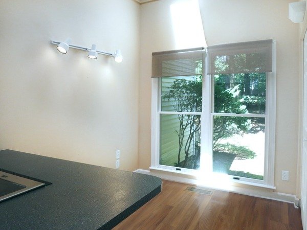The sunny kitchen includes a breakfast area with a vaulted ceiling with two skylights. The kitchen has white cabinets and hardwood floors. The laundry closet is in the kitchen. Kitchen appliances and a washer and dryer are included.